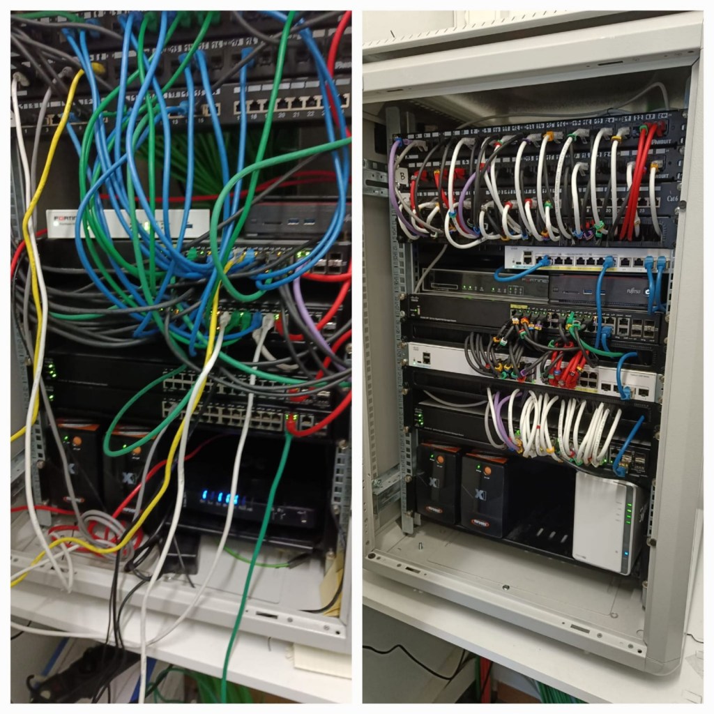 Introducing cable management between switches to permit easier maintenance and air flows. To ensure a perfect stability of the data running on the cables, all of them have been replaced by STP (Shielded Twisted Pairs CAT 6 cables). Labeling rings have been placed on the cables to easily maintain and troubleshoot. Proper color convention has been established based on the type of devices.